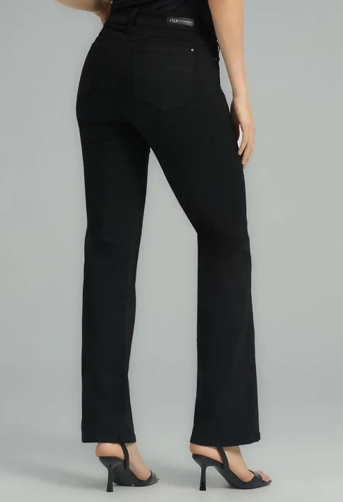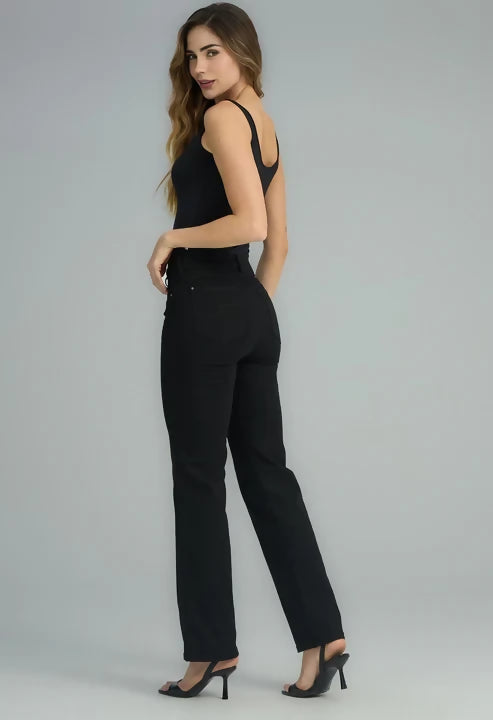 Jean levantacola, tiro alto, lavado negro, bolsillos, bota recta y fondo entero para mujeres.