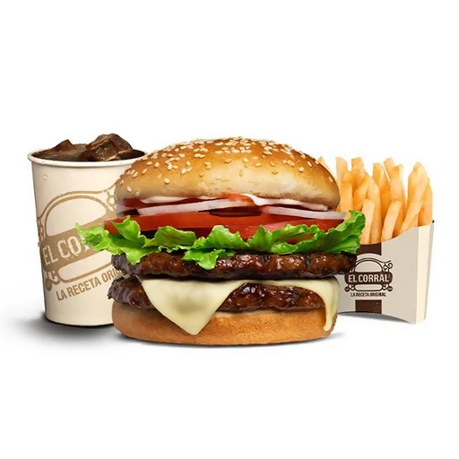 Hamburguesa de dos carnes de 125 g cada una 100% de res a la parrilla con salsa bbq, queso mozzarella, lechuga, tomate, cebolla y salsas + papas medianas (corral o cascos) + bebida